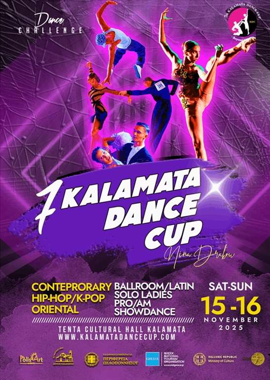 Το 7ο Kalamata Dance Cup 2025 θα διεξαχθεί το προσεχές Σαββατοκύριακο 15 και 16 Νοεμβρίου στην αίθουσα αθλητικών και πολιτιστικών εκδηλώσεων «Τέντα» της πόλης. Περισσότεροι από 1.000 αθλητές όλων των επιπέδων από 15 χώρες και τρεις ηπείρους θα διαγωνιστούν σε πάνω από 20 είδη χορών, ενώ παράλληλα θα πραγματοποιηθούν σεμινάρια χορού από καταξιωμένους προπονητές-δασκάλους, καθώς και εργαστήρια δημιουργικού χορού για άτομα με ή χωρίς αναπηρίες. Εκτός από τη διάδοση του χοροαθλητισμού στην Ελλάδα, στους στόχους των διοργανωτών περιλαμβάνεται και η ενεργή προβολή της πόλης της Καλαμάτας και της ευρύτερης περιοχής ως προορισμό πολυθεματικών εμπειριών.
